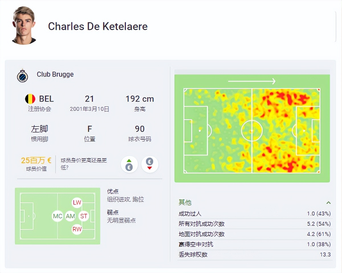 在欧冠小组赛头2轮表现非常惊艳的布鲁日,在他的帮助下赢得比利时联赛的冠军。他与球队的合同到2024年到期,布鲁日并不打算甚至太多的障碍,预计转会费在2500万欧元左右。
