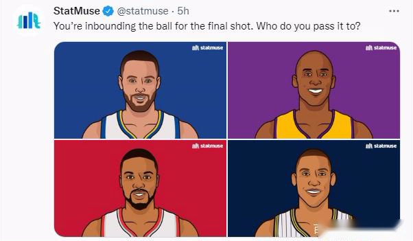 最后老规矩,每日一问时间:当比赛关键时刻,你会将球传给谁?库里、科比、利拉德、米勒四选一。