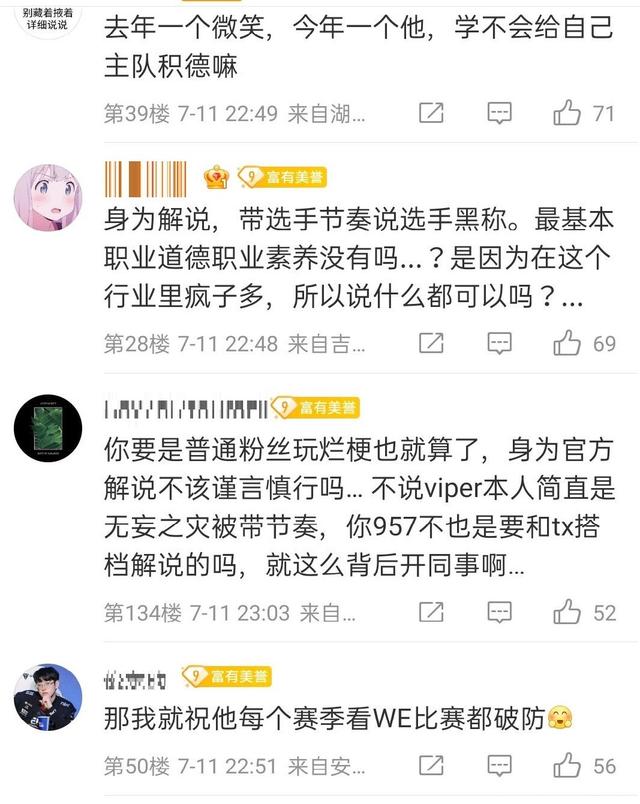 其实事情很简单,就是957直播的时候,有弹幕问他怎么看待TES和EDG的比赛,957来了一句:看老公的状态。于是就被冲了。微博下方的评论如下,有很多EDG的粉丝认为957身为官方解说公开叫选手黑称,带其他战队的节奏,没有职业素养,必须严管!也有人表示怎么不玩其他选手的梗,LPL这么多有黑称的选手,偏偏逮着Viper叫,就是故意的。