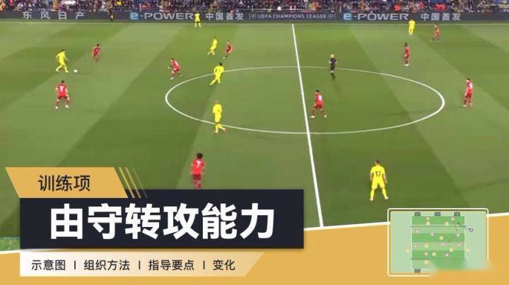 在阵型操练中完成攻防转换的训练,人为制造控球方的人数优势鼓励传控,同时提前安排好反击球员的位置,方便断球后的迅速向前。