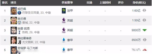 姆巴佩在中锋位置身价排行榜上排名第一,1.6亿欧元的身价不仅在中锋位置上排名第一,在其他所有位置上的身价均排名第一。他是当今世界足坛身价最高的球员。