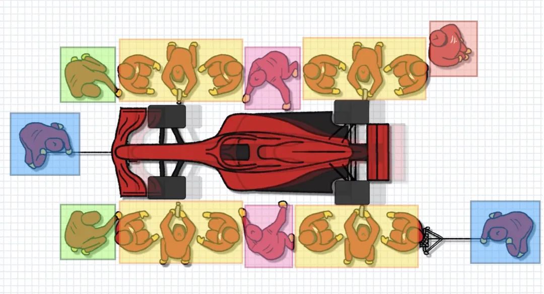 车前和车后的2位千斤顶技师(下图蓝色标注);其中车前千斤顶操作若有意外情况,则有1名备份人员迅速补上; 共12名轮胎装卸技师,其中每个轮胎配备3名技师,每人分别负责轮胎枪操作、卸下旧轮胎以及装上新轮胎 (黄色标注); 2名更换前翼的备用技师,仅在需要更换前翼时使用(绿色标注); 2名在车身中部负责扶稳赛车的技师(粉红色标注) 1名进站控制员负责向车手发送进站完成的总信号(红色标注)