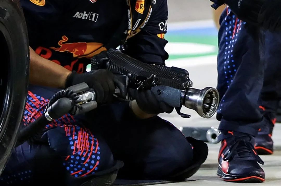 每分钟转速超10000转的轮胎枪 最后,进站控制员观察周围情况并向车手发送进站完成的信号,车手看到信号便立即驶出赛车。在以往的F1进站中,这一信号的发送方式为车前被称为“棒棒糖(Lollipop)”的指示牌。“棒棒糖”撤走,示意车手可以离开。