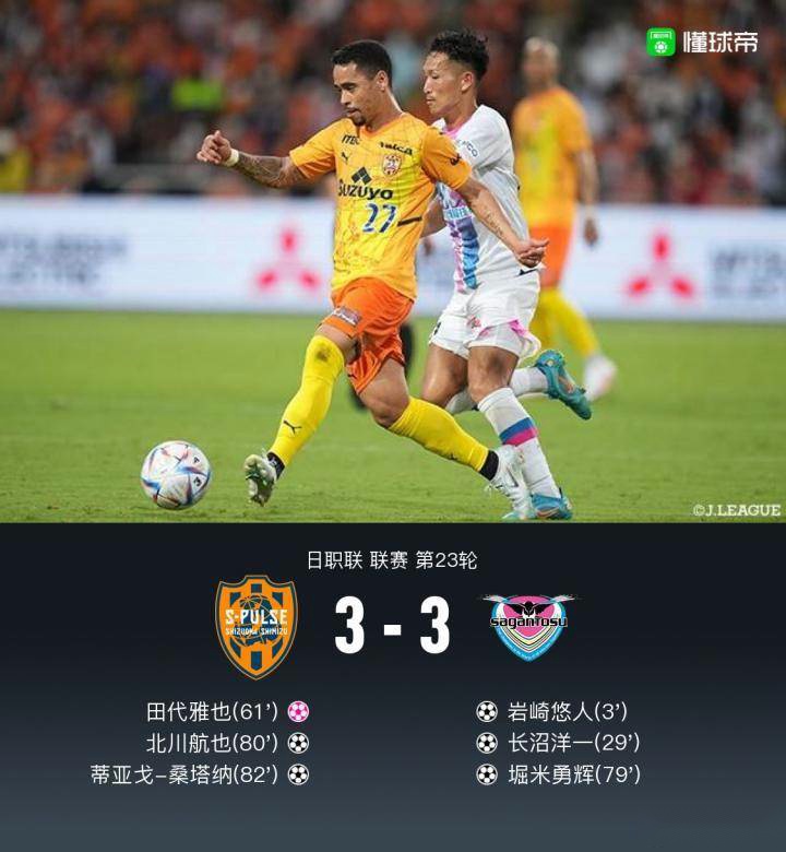 北京时间7月31日17:03,2022赛季J1联赛第23轮的最后一场较量,清水心跳坐镇IAI日本平球场,迎战鸟栖砂岩。上半场,森谷贤太郎助攻岩崎悠人闪击,宫代大圣助攻新援长沼洋一扩大比分,清水心跳暂时0-2鸟栖砂岩;下半场,山原怜音助攻白崎凌兵扳回一城,堀米勇辉远射破门,白崎凌兵和蒂亚戈-桑塔纳3分钟连进两球神奇扳平比分。最终,清水心跳主场3-3绝平鸟栖砂岩。