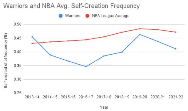 望向今年复兴夺冠的金州勇士,我们会看到一个疯狂的另类。自打史蒂夫·科尔拿起勇士教鞭,除了2019-20那个被伤病摧毁的赛季,勇士每一年的自主创造出手比例都是联盟倒数前三。