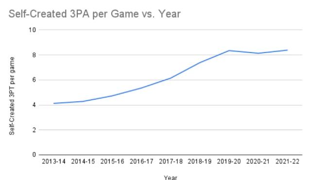 从数据上看,球员们自主创造出手的数量在过去9年里有增长的趋势。