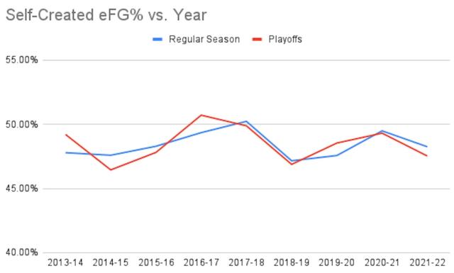 从视觉上来说,这一结果在两方面显得非常有趣。首先,这证明即便各队的突破产量和效率都在增加,联盟整体的自主创造出手效果却并没有变得更好。其次,常规赛和季后赛在自主创造出手效率方面并没有太大差别——人们往往觉得防守强度更大的季后赛会让这些出手难度增加、效率降低。