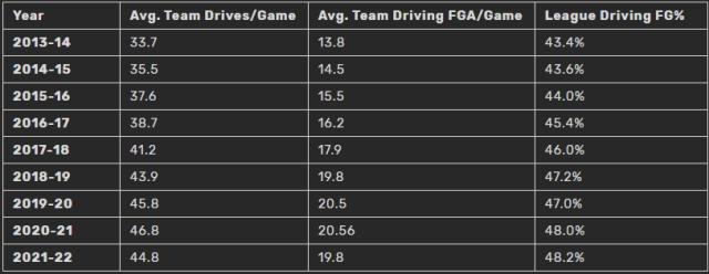 上表的三列分别是联盟各队平均场均突破数、平均场均突破出手数和平均突破出手命中率。结果显示过去9年,各队的突破次数和出手数有明显的上涨趋势,命中率也越来越高。人们很容易联想到在球场空间变广阔的情况下,突破的条件变得更加有利,而防守暂时还无法跟上这样的进攻。