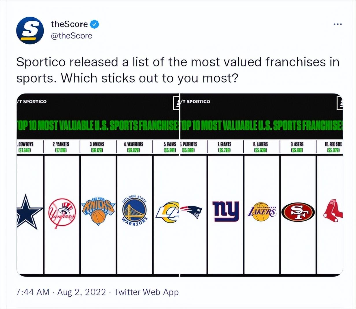 北京时间8月3日,美国商业网站Sportico发布了全美最贵的10支球队,这里面NBA球队只有三支分别是尼克斯、勇士、湖人,有5支都是NFL球队,MLB只有两支。