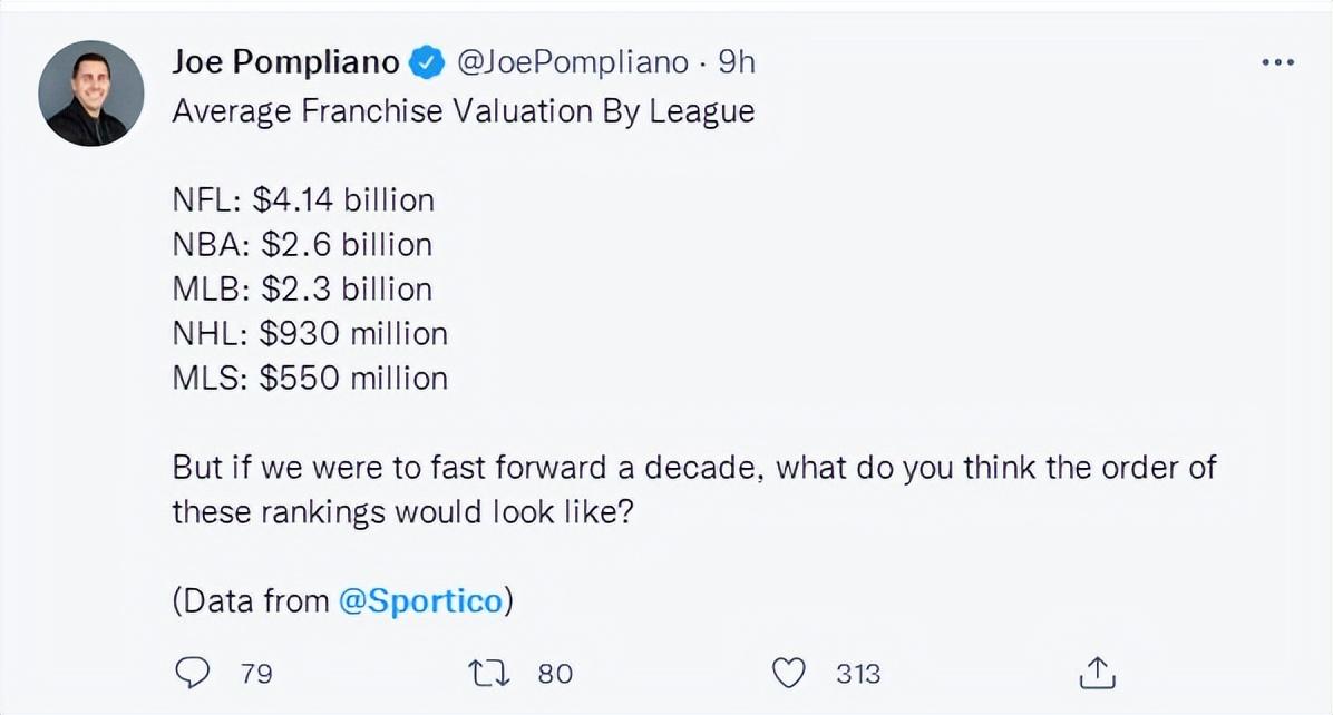 全美体育商业记者Joe Pompiiano曝出了全美五大体育联盟的平均球队估值: