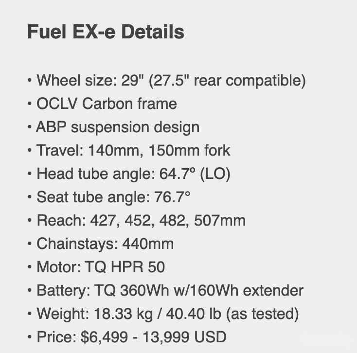 公平地说,在这个轻量级e-MTB类别中没有很多其他车型,至少是就主流品牌而言。Fuel EX-e出现之前的两个主要车型是 Orbea Rise和Specialized Turbo Levo SL。 Rise使用 Shimano 全尺寸EP8电机,但它在功率方面的调教并不好并且使用了较小的电池,而Levo SL使用的电机与它“S”家族的全功率e-MTB兄弟车型不同。所有三个竞争对手都采用碳纤维车架,重量在 18-19 公斤左右。