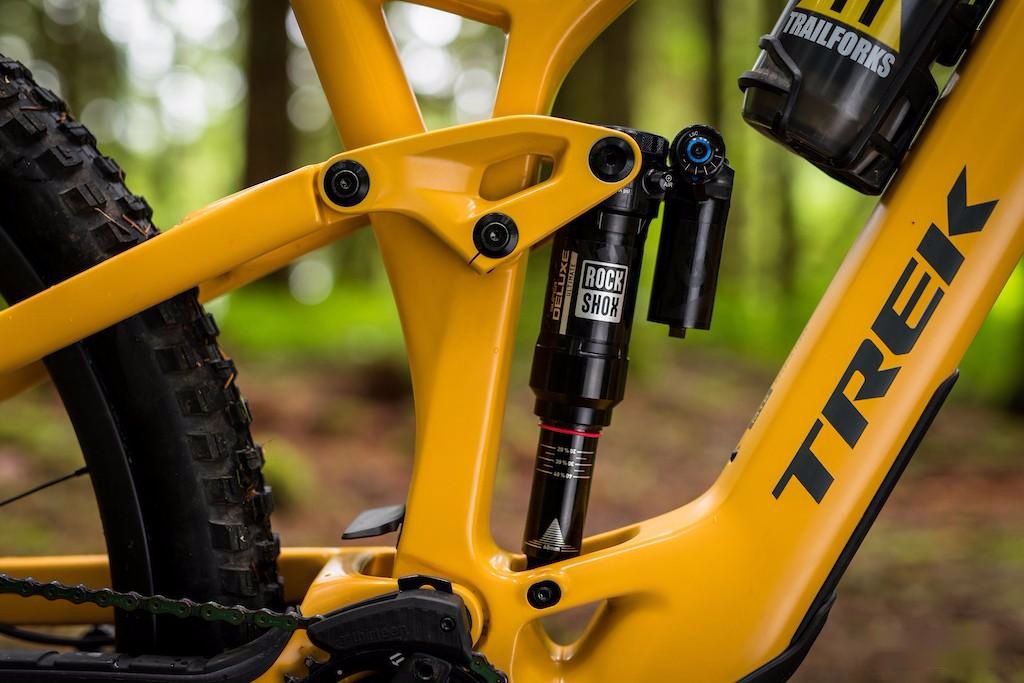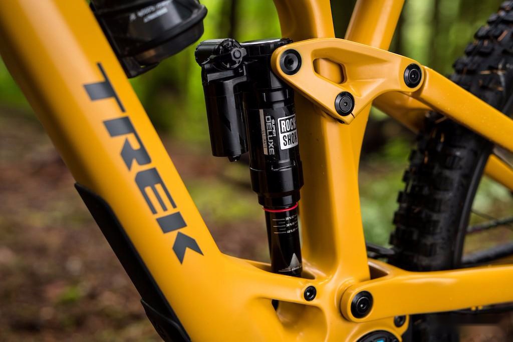 Trek自2011年以来一直使用的主动制动枢轴 (ABP),这款四连杆系统可以说是久经考验。围绕后轴的同向旋转轴用于将制动力与车架隔离。该系统通过安装在耳轴上的 230x60mm RockShox Super Deluxe Ultimate Air 提供 140mm 的行程,但系统也适用于弹簧减震器。