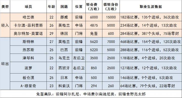 球员转入: 在今年夏窗,曼城花费了约1亿欧元引进了挪威锋霸哈兰德和英格兰中场菲利普斯,德国门将莫雷诺也免签加盟球队。