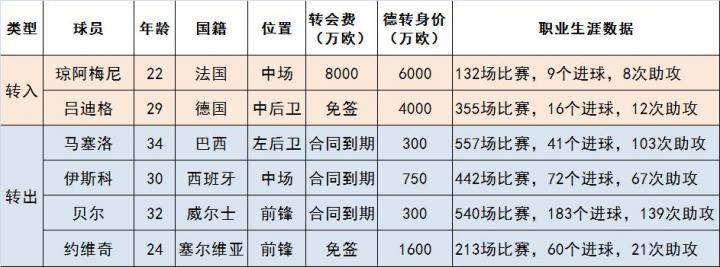 球员转入: 皇马在今年夏天花费了8000万欧元的高价买入了法国后腰琼阿梅尼,加速了对于典礼三中场的更新换代;而在去年夏天尝过免签阿拉巴的甜头之后,皇马再次运作德国中卫吕迪格加盟,球队上赛季略显单薄的后防线得到了有效补强。