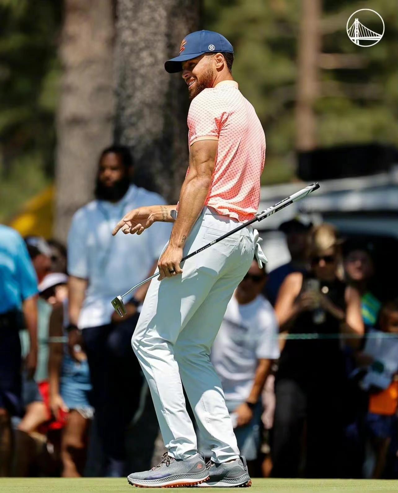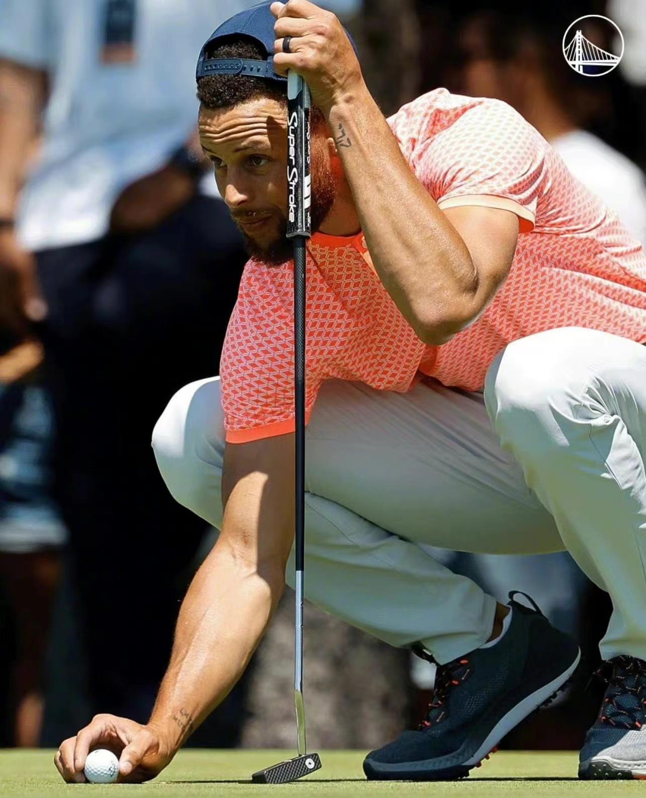 库里现身个人组织的高尔夫表演赛,粉橙色的polo衫搭配白色贴身西裤,妥妥的职场精英造型。