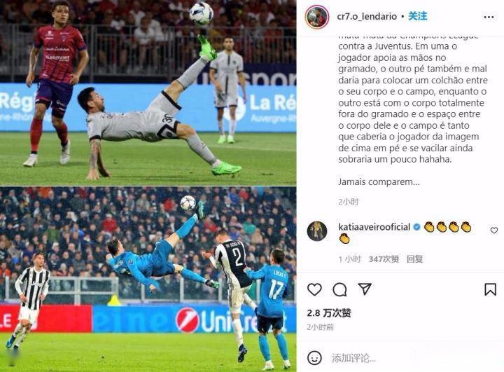 Factos哥发出了两人分别打进倒钩时的图片,并写道:一个是倒钩,另一个是凌空射门。一个是法甲对阵克莱蒙的比赛,另一个是欧冠淘汰赛对阵尤文图斯的比赛。一个是球员把手撑在草坪上,一只脚也撑在草坪上,身子和场地之间连一个床垫都放不下;另一个则是完全从草坪腾空而起,身体和场地之间还有空间。上面那张图的球员(梅西)体态还有点不太稳定,哈哈哈……绝不要比较……