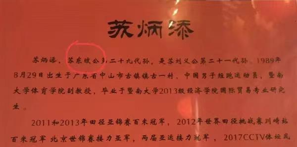 在苏氏宗祠名人介绍之中,对于苏炳添的介绍是:苏东坡公第二十九代孙,是苏刘义公第二十一代孙,1989年8月29日出生于广东省中山市古镇镇古一村,中国男子短跑运动员,暨南大学体育学院副教授,毕业于暨南大学2013级经济学院国际贸易专业研究生。