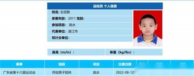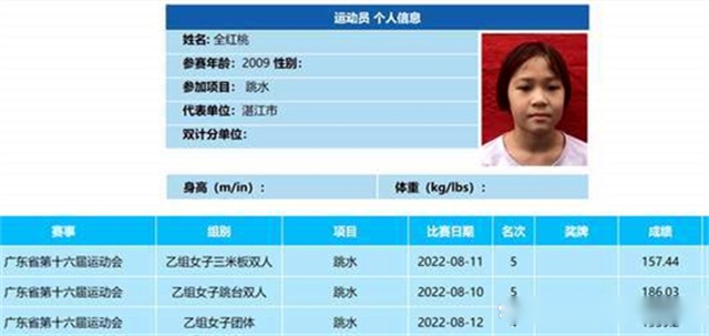 在近日举行的广东省运会跳水比赛上,全红婵的弟弟妹妹都有参赛,但成绩却与同期的全红婵的成绩相差甚远。其中,13岁的四妹全红桃身兼三项,获得乙组女子团体的第4名,以及乙组女子跳台双人、乙组女子三米板双人决赛中全部拿到第5名;11岁的五弟全进鹏,则代表湛江队在8月12日举行的丙组男子团体决赛中获得铜牌。