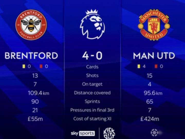 根据天空体育赛后的数据,布伦特福德全队赛后总跑动距离达到109.4km,曼联只有95.6km,比对手少了13.8km,现在英超平均一名球员的全场跑动距离为10.14km。