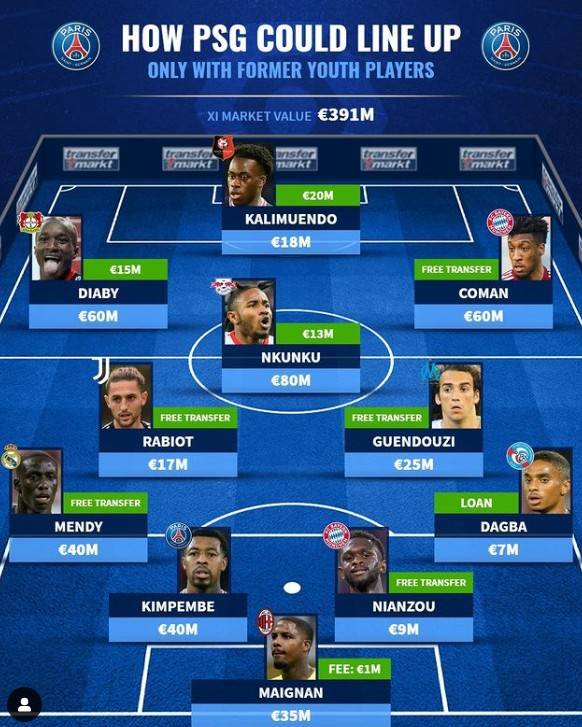 巴黎圣日耳曼有很多青训球员加盟了其他球队,德国知名足球数据网站“转会市场”列出了巴黎青训出品的球员组成的最佳阵容。在“转会市场”所列出的这份阵容中,莱比锡攻击手恩昆库和拜仁慕尼黑边锋科曼领衔。这些球员大部分都是自由转会离开巴黎,目前只有金彭贝还在巴黎效力。