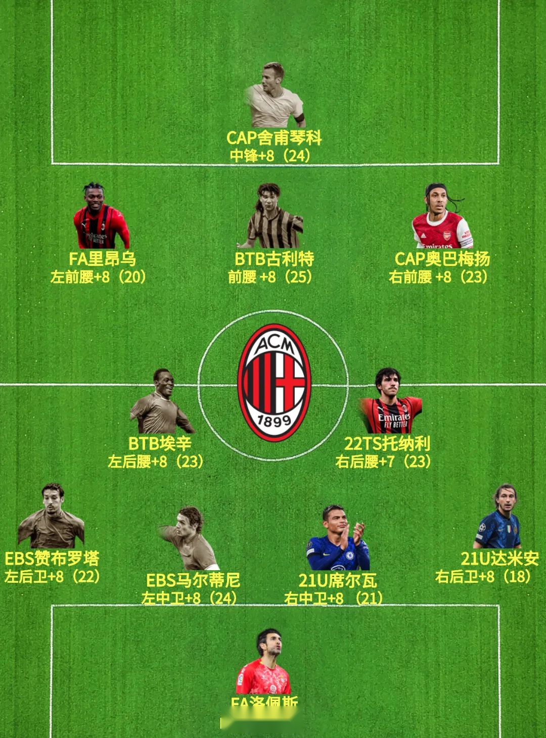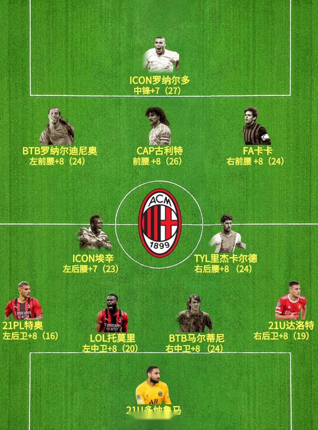 这里给出两套阵容参考,当然米兰套球员数量众多,两套也很难囊括所有好卡。根据预算情况的不同,大家选择的赛季也会有差异。以顶配阵容来说,如果想用ICON大罗+ICON古利特,那么势必要在边后卫这里降工资,20A特奥可能是最好的选择;而如果觉得性价比阵容的球员也偏贵,那么可以适当降低强化等级或更换赛季,比如CAP舍甫琴科换成CA舍甫琴科等。