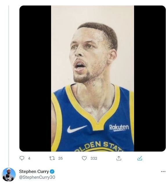 球迷制作了 一幅库里的肖像画太过于逼真,这让库里非常震惊,他更新社媒转发了这张画像。