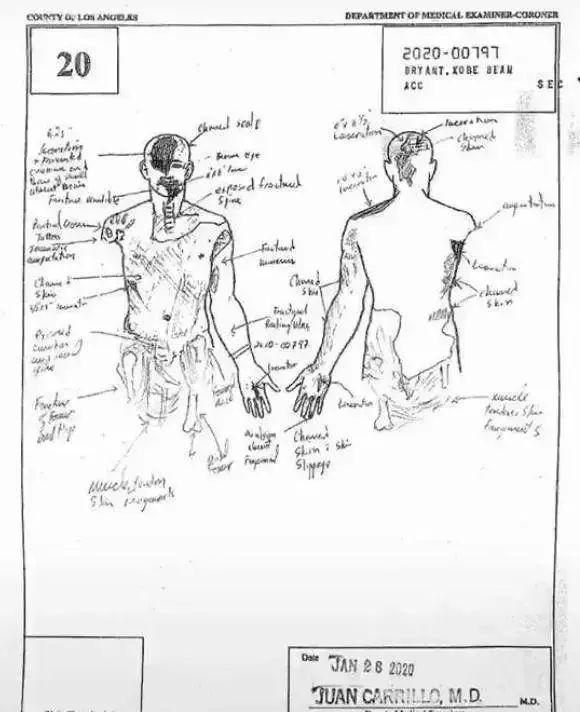 科比是一位骄傲的人,他在篮球上取得了伟大的成就,是NBA历史前十的球星。但科比离去时很糟糕,科比乘坐的直升机失去控制,从高空中坠落。科比的尸检报告显示,在生命的最后时刻,科比遭遇了30次撞击,失去了一只胳膊和一双腿,残骸满是伤痕且面目全非。工作人员需要经过DNA比对才确认那是科比的遗骸。
