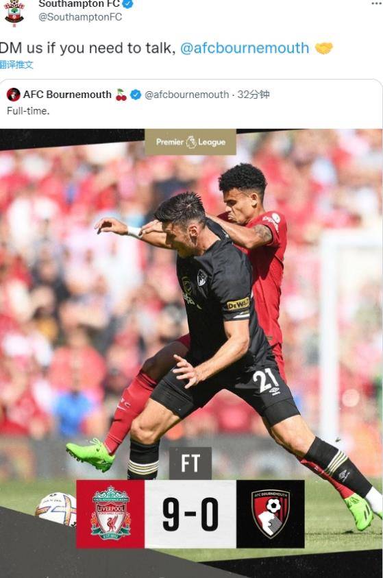 当今天伯恩茅斯0:9被利物浦血洗后,曾经两次经历净吞九蛋惨案的南安普顿不忘官推调侃伯恩茅斯。 南安普顿官推写道:如果你需要找人倾诉,请私信联系我们。 @伯恩茅斯 ”