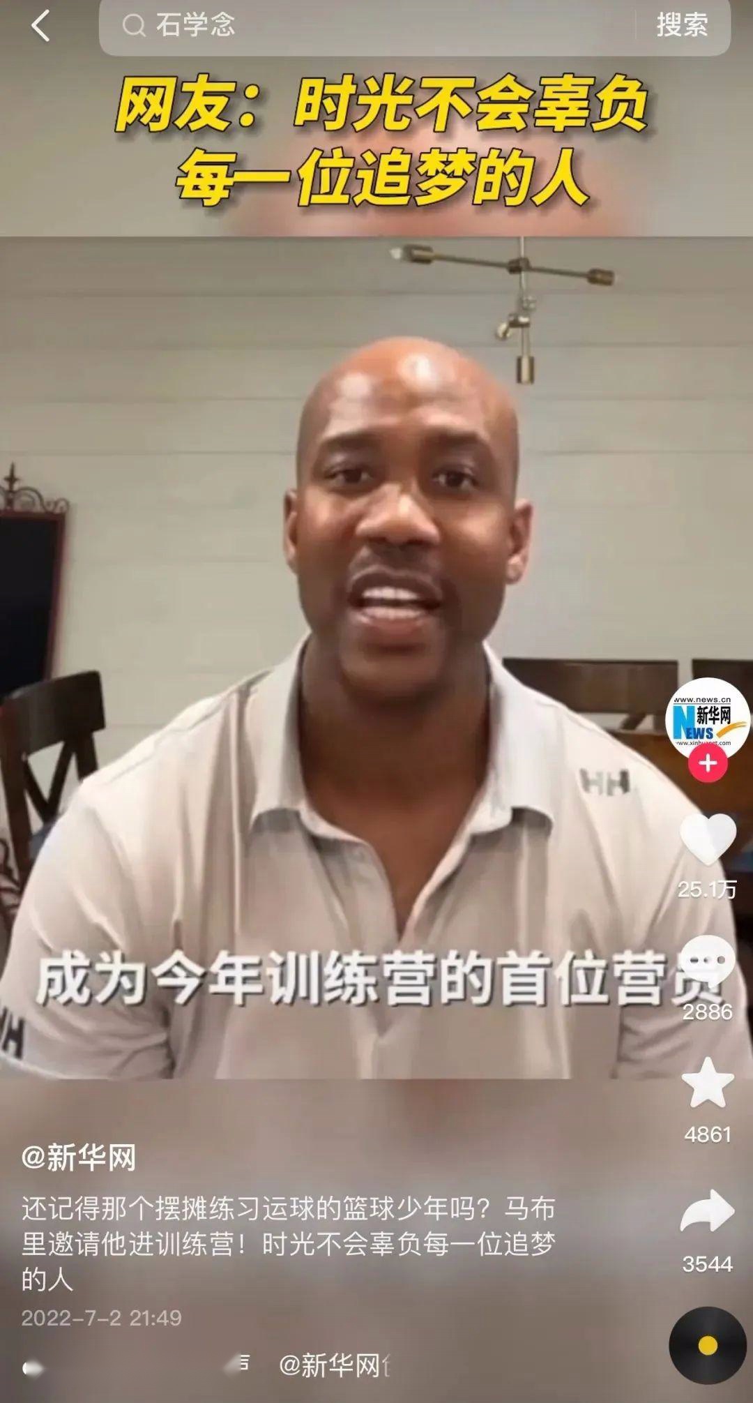 “你的经历和你的那些绝杀,让我想起了我的过去。”今年6月,马布里通过视频向身在贵州乡村的“摆摊篮球少年”石学念发出邀请,而石学念也欣然接受并成为训练营的首位营员,此事获得众多网友的点赞,并得到央媒的跟踪报道。