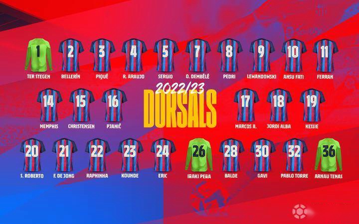 巴萨公布了本赛季一线队阵容及各球员号码,在26名球员中,西班牙球员一共有15人。