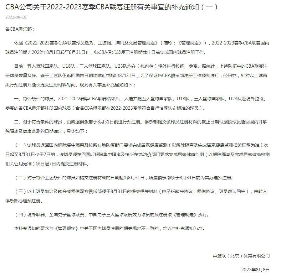 此前在8月8日,CBA公司就向各俱乐部下发了《CBA公司关于2022-2023赛季CBA联赛注册有关事宜的补充通知(一)》。其中明确提出,代表中国男篮在海外参赛和拉练的国家队员如果来不及在8月31日之前完成注册,可以申请延期注册,但俱乐部必须在注册截止前为其进行预注册。既然CBA规则赋予了俱乐部预注册的权利,所以,今年为国出战的国手们基本都被各自所属的俱乐部进行了预注册。