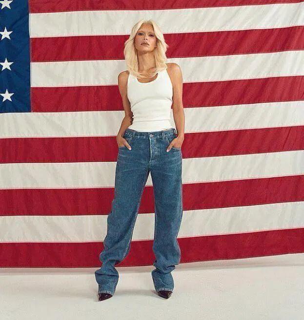 事情是这样的,金·卡戴珊在星条旗前拍了一组照片。金·卡戴珊的上半身穿着还是很正常的,她穿了一件很能代表美国文化的牛仔外套。但下半身就不忍直视了,她赤臀出镜。