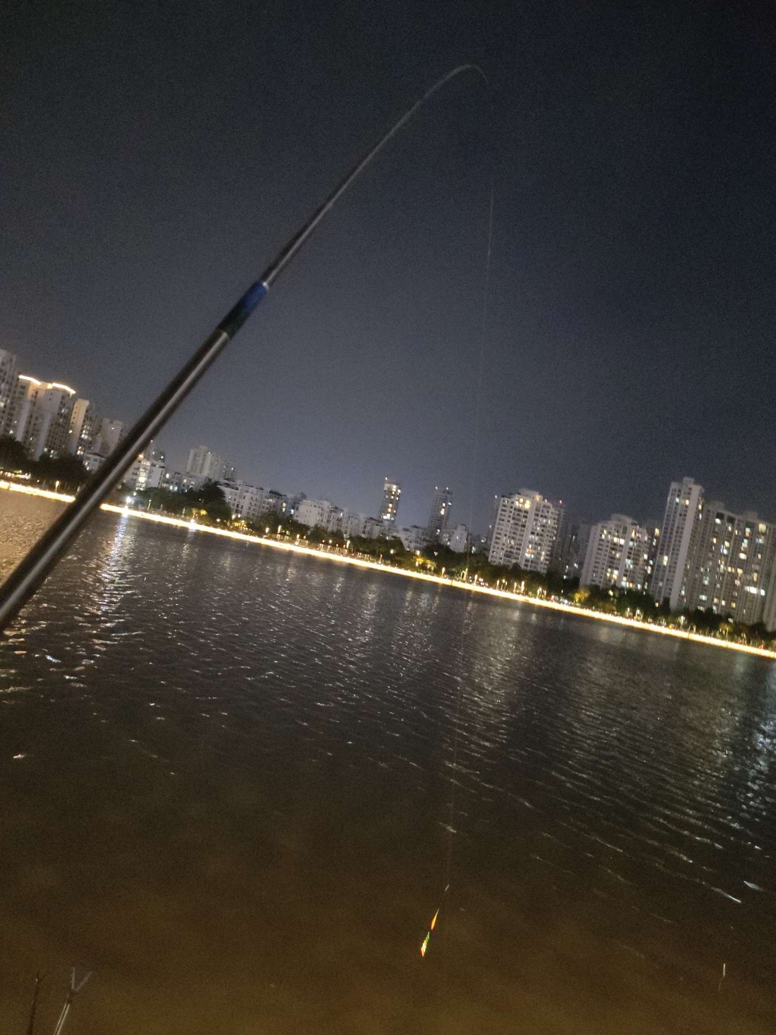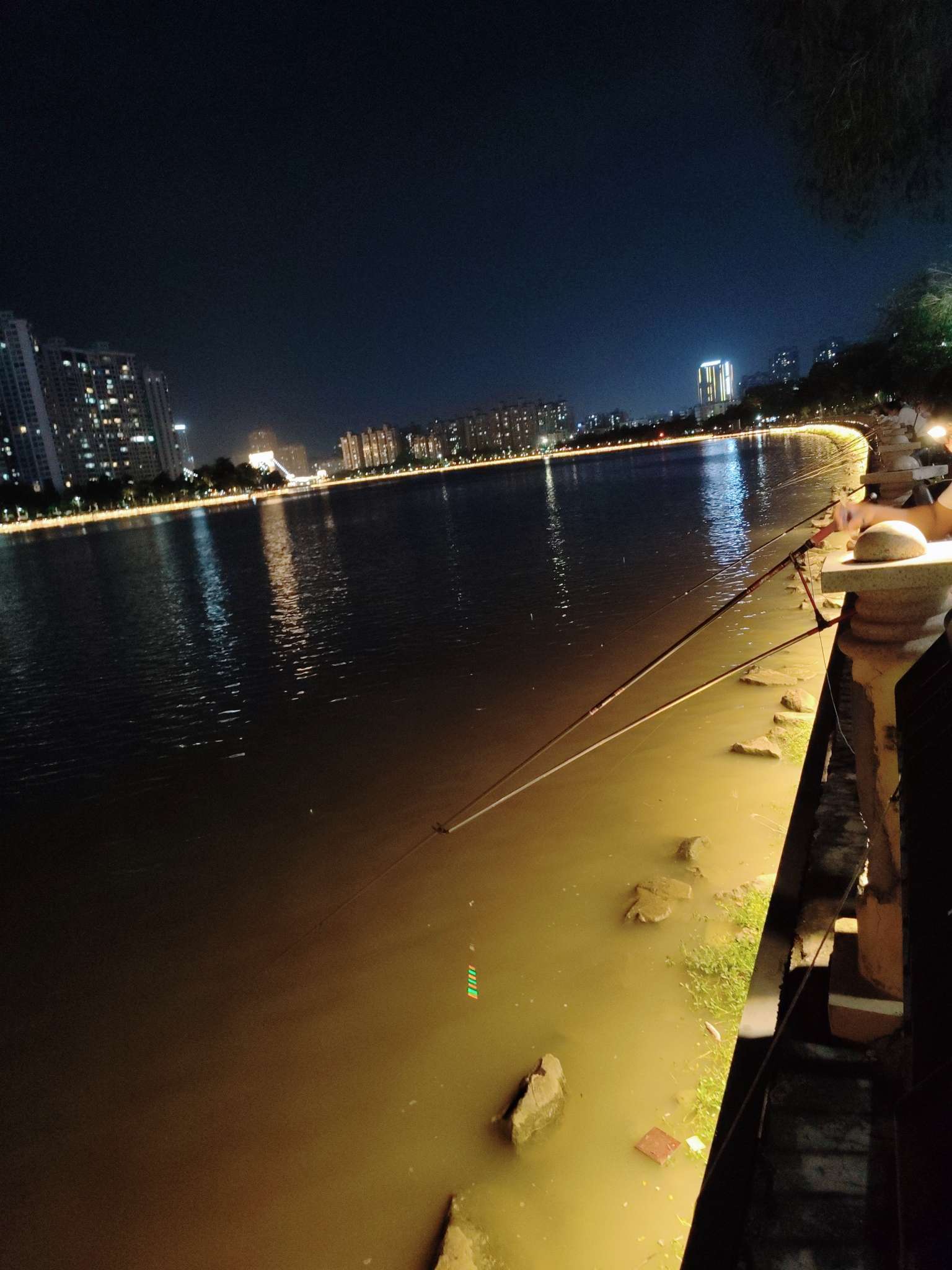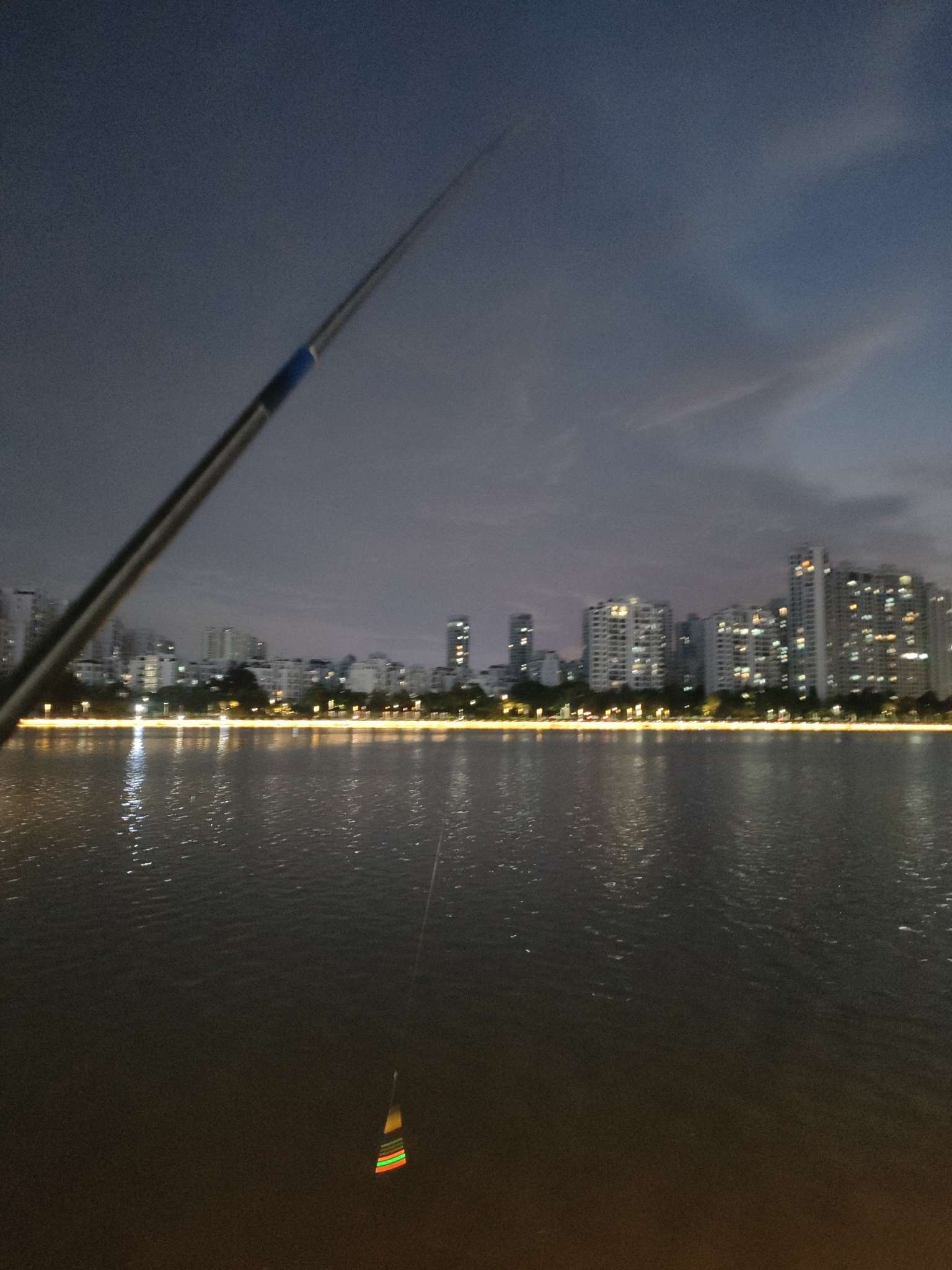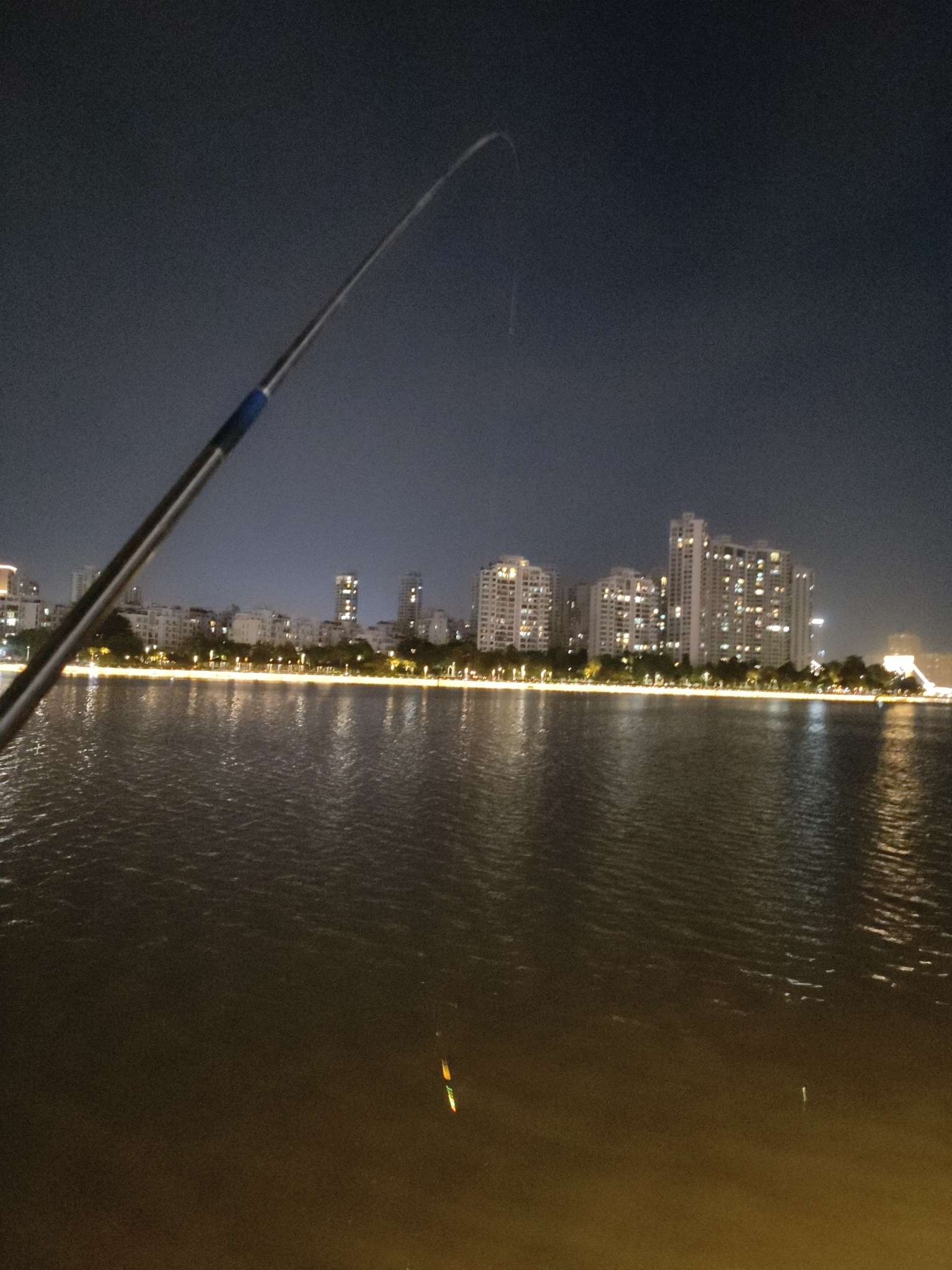 一边钓一边观察着水面,码头上比较暗,但河边有景观灯明暗之下就不太看得清钓鱼人。不过,哪位大神猛的起竿的生声音从刚来一直持续到现在。也是竿子好加上作钓环境空旷,要是在河边,浮漂早都上树好几次了。