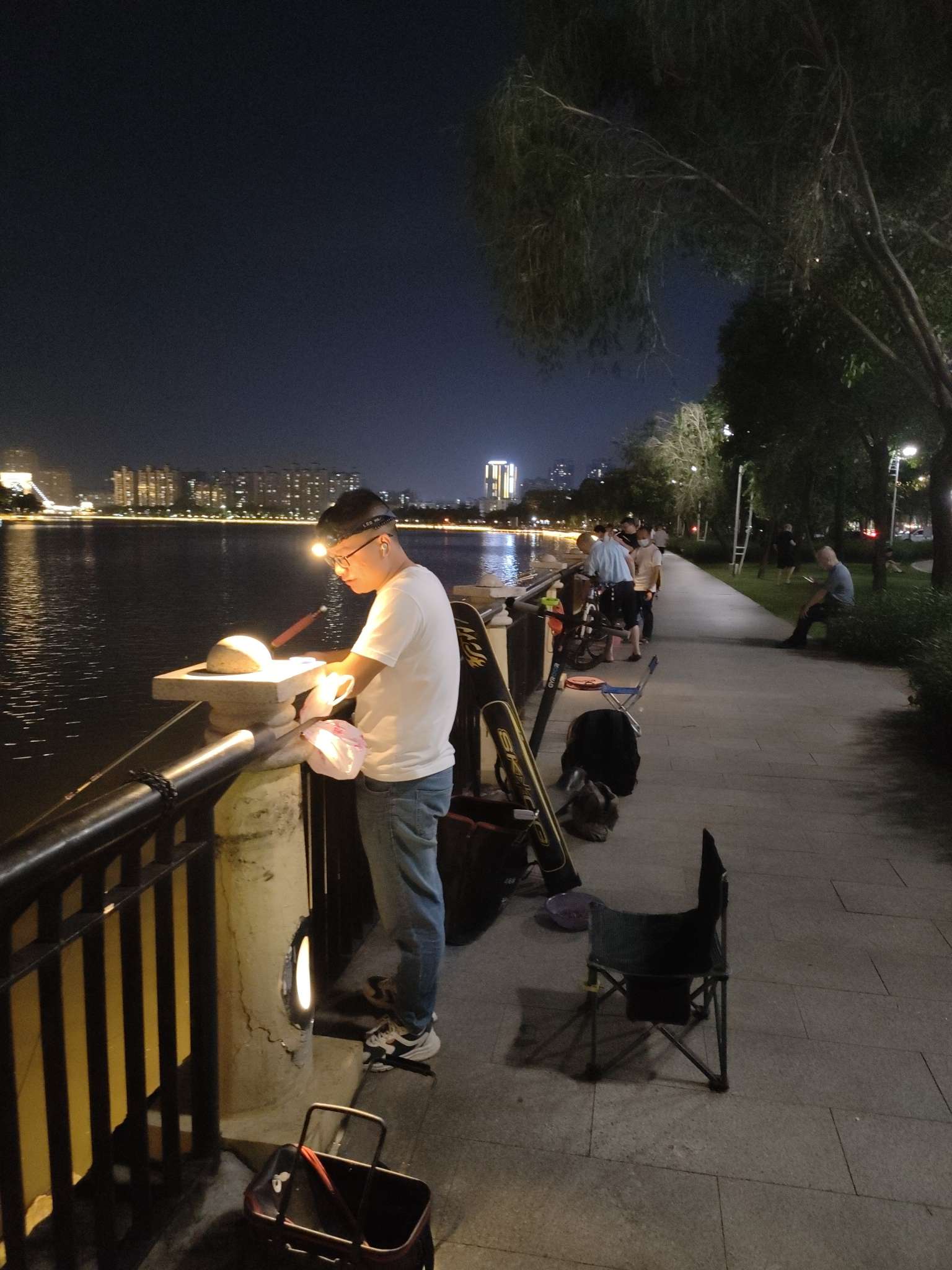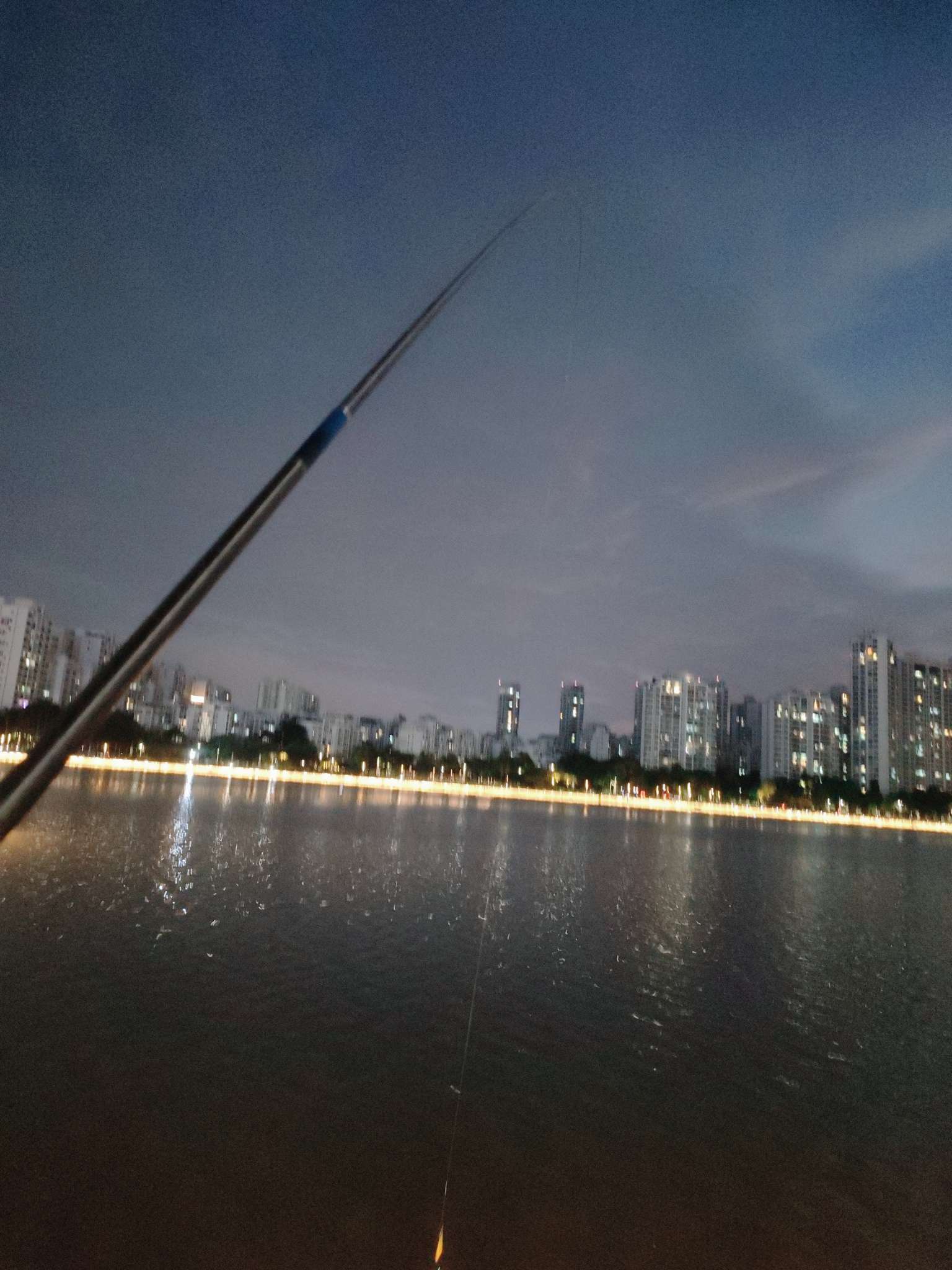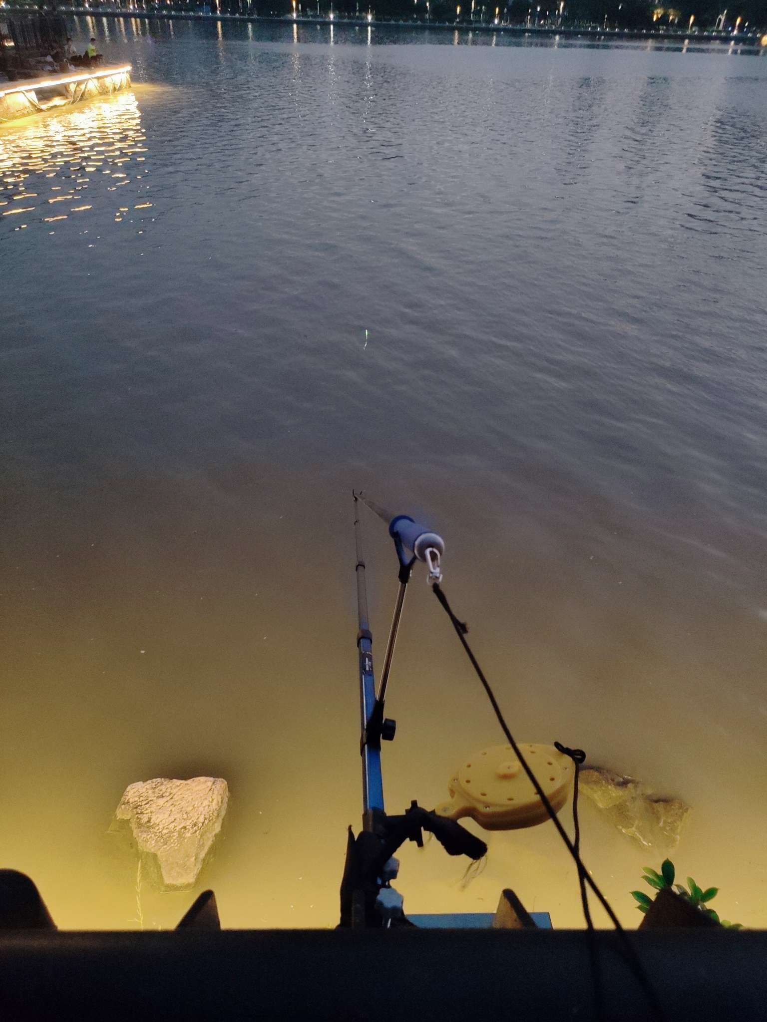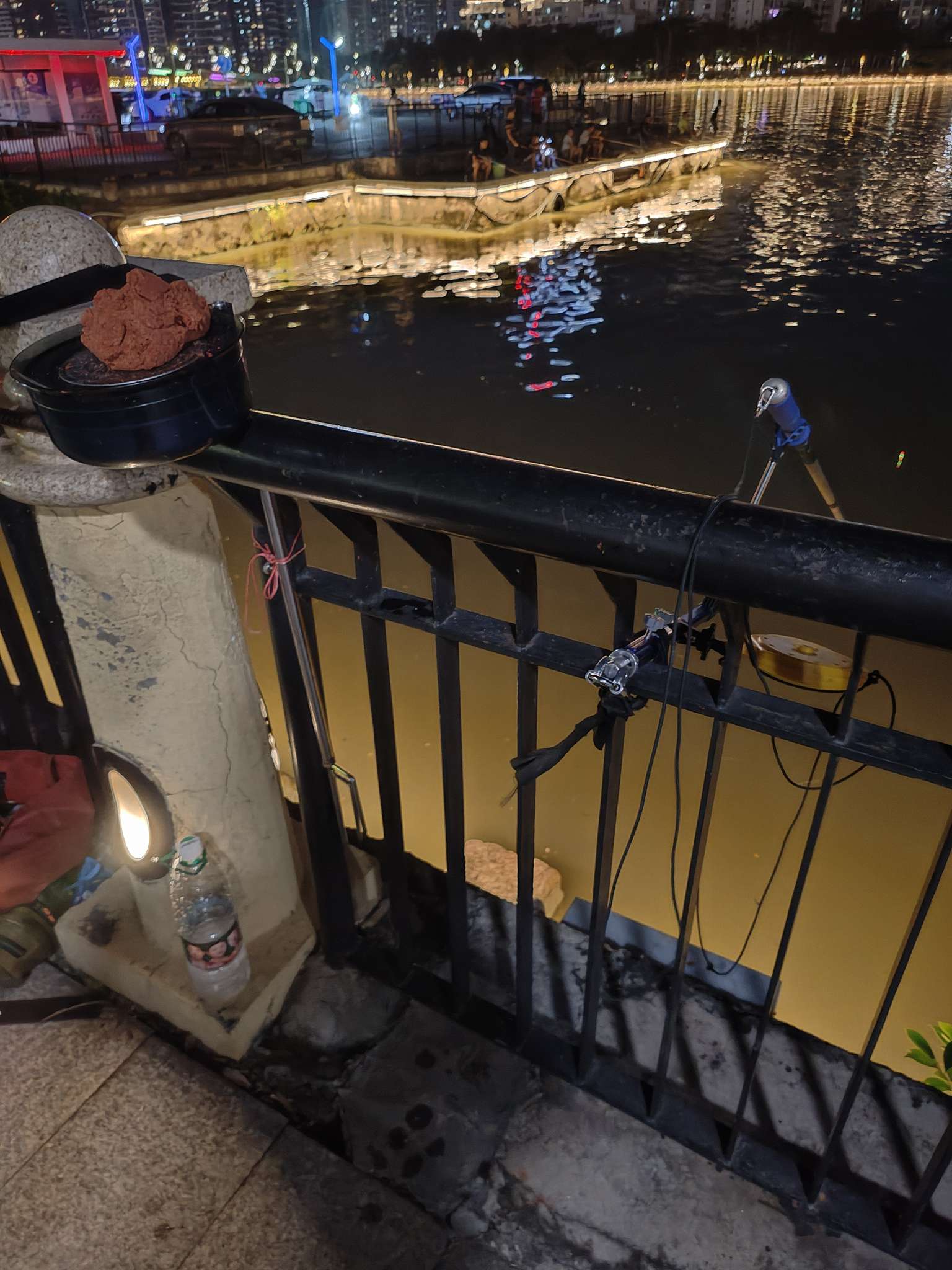 一边钓一边观察着水面,码头上比较暗,但河边有景观灯明暗之下就不太看得清钓鱼人。不过,哪位大神猛的起竿的生声音从刚来一直持续到现在。也是竿子好加上作钓环境空旷,要是在河边,浮漂早都上树好几次了。
