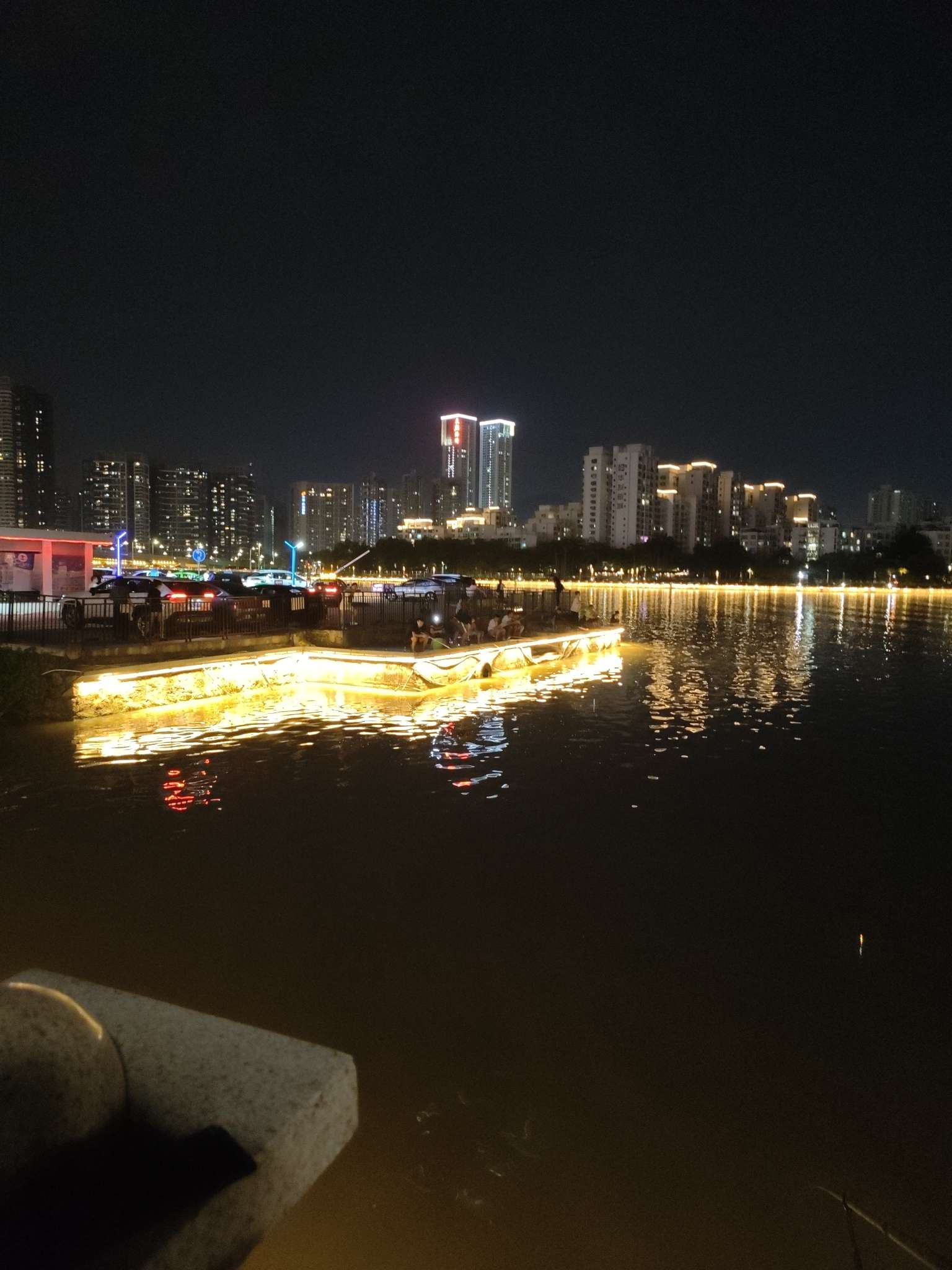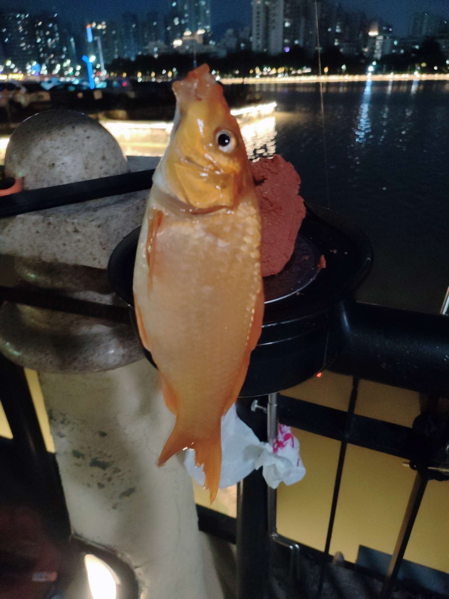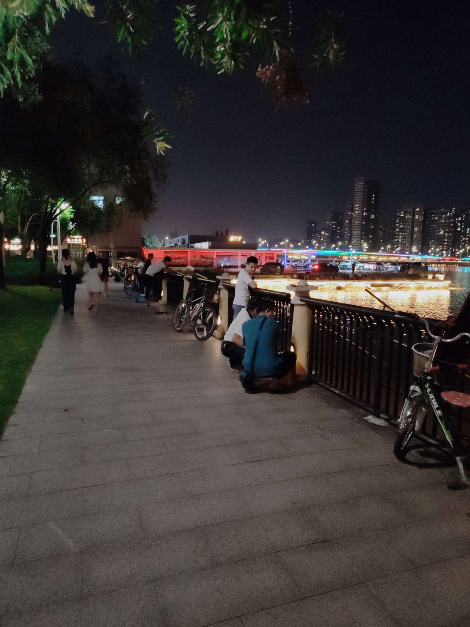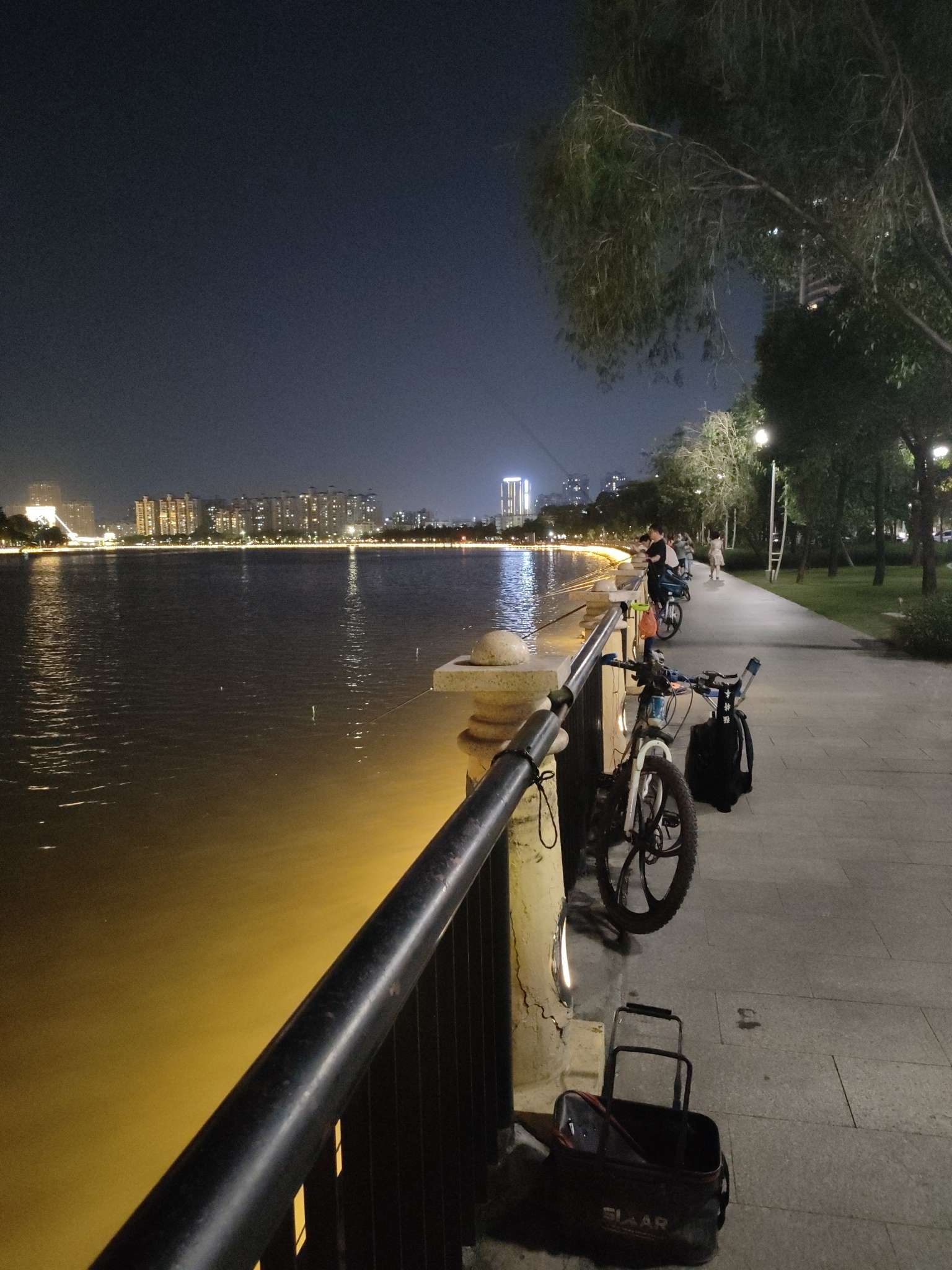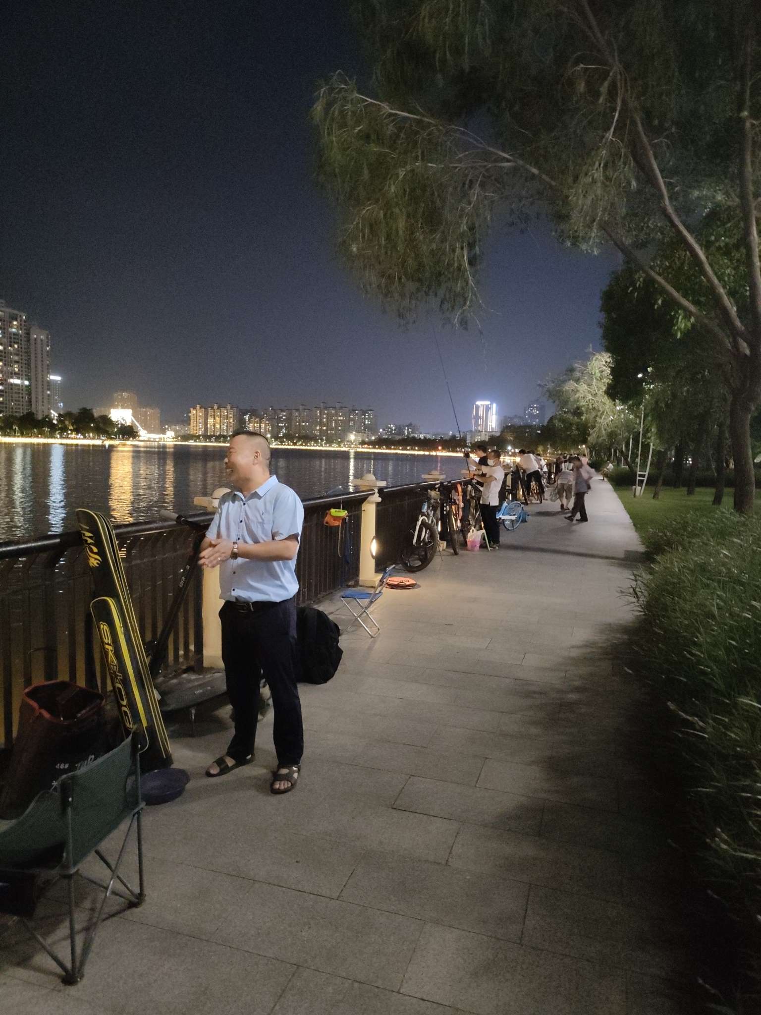 一边钓一边观察着水面,码头上比较暗,但河边有景观灯明暗之下就不太看得清钓鱼人。不过,哪位大神猛的起竿的生声音从刚来一直持续到现在。也是竿子好加上作钓环境空旷,要是在河边,浮漂早都上树好几次了。