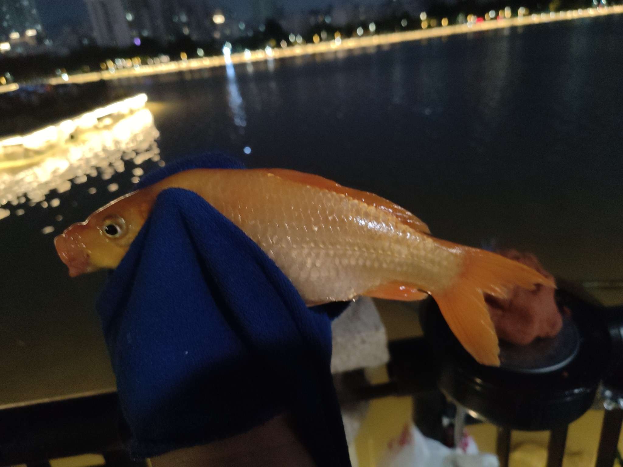 遛了一会,拉到岸边顶出水,哇塞,一尾鲤鱼。钓友帮忙抄上岸,打灯一看,居然还是一尾颜值很高的红鲤鱼。