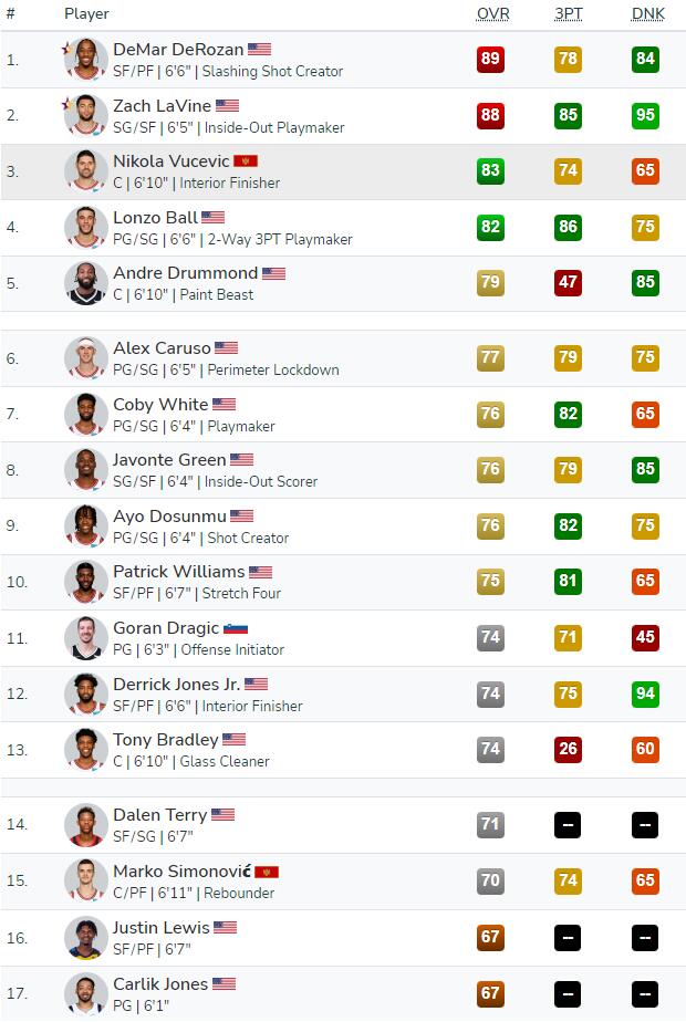 德玛尔-德罗赞89,扎克-拉文88,尼古拉-武切维奇83,隆佐-鲍尔82,安德烈-德拉蒙德79,亚利克斯-卡鲁索77,科比-怀特76,杰翁特-格林76,阿约-多苏穆76,帕特里克-威廉姆斯75,戈兰-德拉季奇74,德里克-琼斯74,托尼-布拉德利74,达伦-特里71,马克-萨玛诺里奇70,贾斯汀-刘易斯67,卡里克-琼斯67。