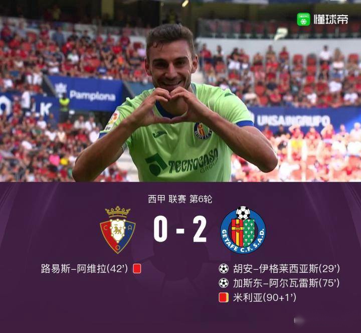 北京时间9月18日20:00,西甲第6轮,奥萨苏纳对阵赫塔费。上半场,胡安-伊格莱西亚斯一脚高质量的小角度推射,攻破了奥萨苏纳的球门,赫塔费客场1-0领先,路易斯-阿维拉蹬踏对手,主裁判在查看VAR后直红将其罚下。下半场,加斯东-阿尔瓦雷斯混战中头球破门,赫塔费2-0,替补出场的米利亚两黄变一红被罚出场。全场比赛结束,十人奥萨苏纳0-2十人赫塔费,遭遇主场首败。