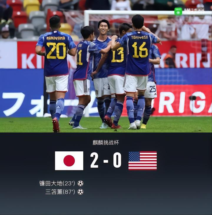 北京时间9月23日20:25,麒麟挑战杯在德国杜塞尔多夫的水星娱乐竞技场 争夺,日本对阵美国。普利希奇训练中受伤本场缺阵。上半场,费雷拉错失良机,守田英正助攻镰田大地推射破门。下半场,马特-特纳屡救险,三笘薫替补登场一条龙破门锁定胜局;美国全场0射正。最终,日本2-0轻取美国。