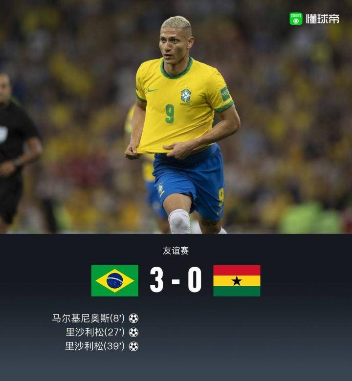 北京时间9月24日02:30,巴西与加纳在法国勒阿弗尔的海洋体育场进行一场友谊赛。上半场,拉菲尼亚主罚角球助攻马尔基尼奥斯头槌首开记录,随后内马尔两度助攻里沙利松破门上演梅开二度。下半场,安德烈-阿尤头槌击中横梁,库尼亚错失良机。最终,巴西3-0轻取加纳。