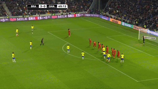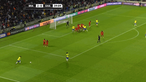 第39分钟,内马尔主罚定位球再送助攻,里沙利松抢前点甩头破门上演梅开二度,巴西3-0领先!