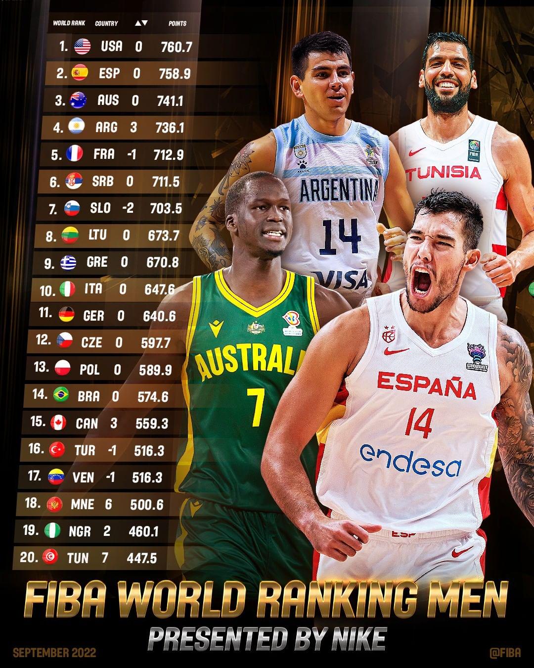 今天下午,FIAB公布了最新一期男篮排名,美国、西班牙和澳大利亚位居前三,中国男篮前进一位,排名世界第27亚大区第4。