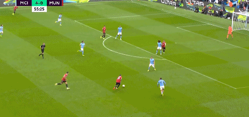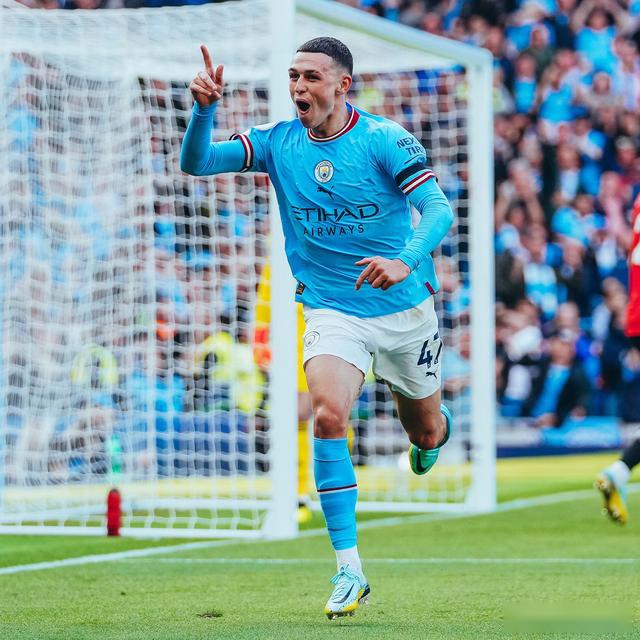 第 44 分钟,德布劳内中路策动进攻,哈兰德左路带球后送出低平球传中,福登跟进撞射梅开二度,曼城 4-0 领先曼联。