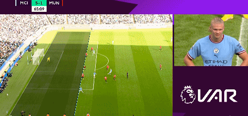 第 34 分钟,德布劳内左侧角球传中,哈兰德抢点头球攻门,虽然马拉西亚竭尽全力解围,但球已经越过门线,曼城 2-0 领先曼联。