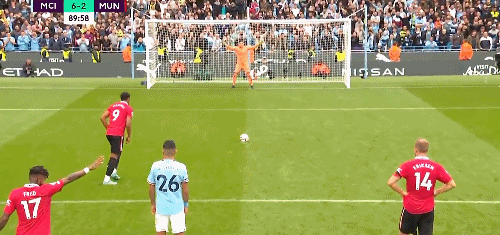 第 90 分钟,坎塞洛禁区内绊倒马夏尔,主裁判判罚了点球。随后马夏尔主罚命中右上角梅开二度,曼联将比分扳成 3-6 。