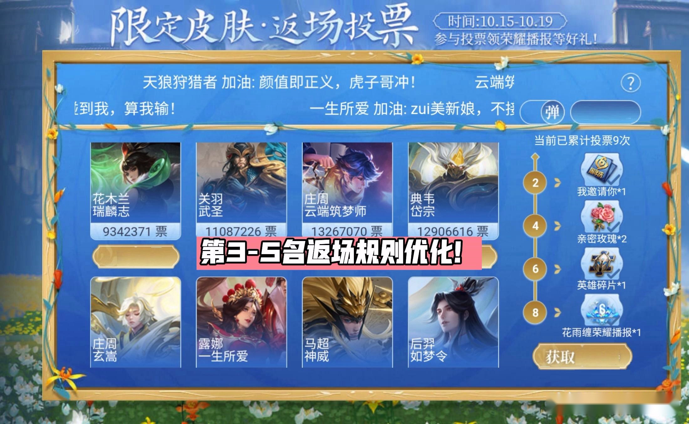 最后需要注意的是今年的返场名额规则会有所调整,虽说依旧是排名前五的皮肤返场,但第三至第五名的票选规则会优化,主要原因是玩家反馈受规则所限,部分皮肤会占用返场资源,出现连续返场的情况,比如百里守约朱雀志和铠青龙志就连续两年进入前五。小编觉得可以删除3选1的规则,将第3-5名改为全部返场,代价便是不再进入候选名单,当然具体细节得等官方正式公布。