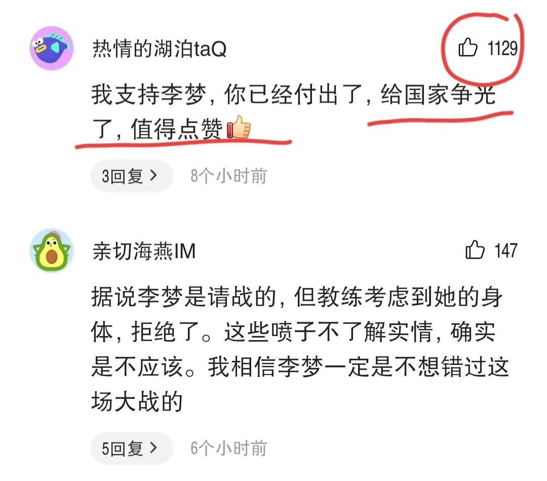 但有少数网友却把矛头对准了李梦。一位头像是美少女的网友说道: “这个银牌和你关系不大吧,还站C位。” 李梦毫不客气地回怼到: “难道跟你有关系?” 稍微理智一点但又非常沮丧的网友表示: “决赛为什么不拼一下呢?中国所有的球迷都觉得你这场能上,遗憾,你不觉得遗憾吗?” 他还艾特了李梦。