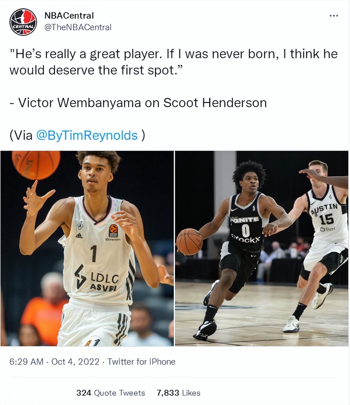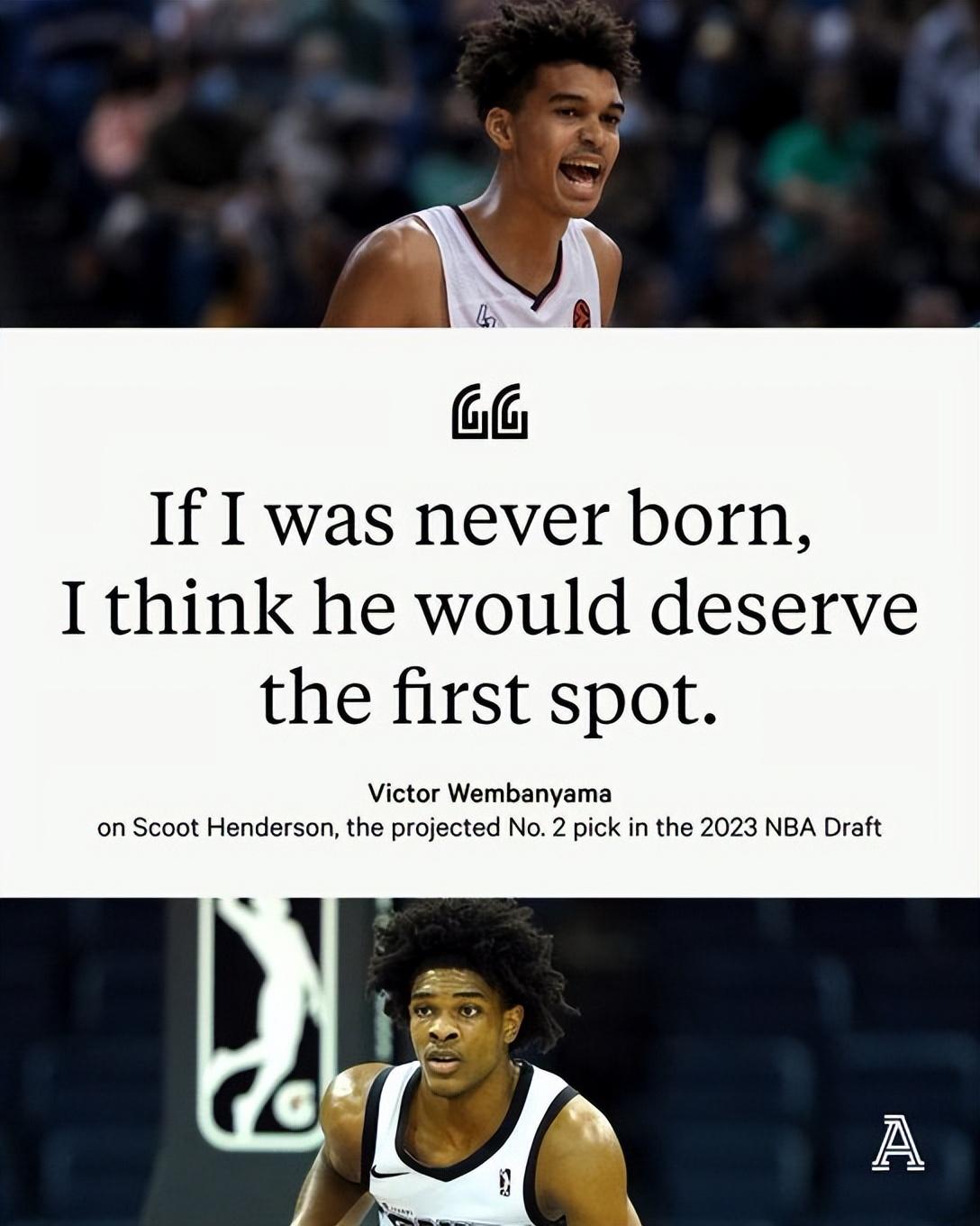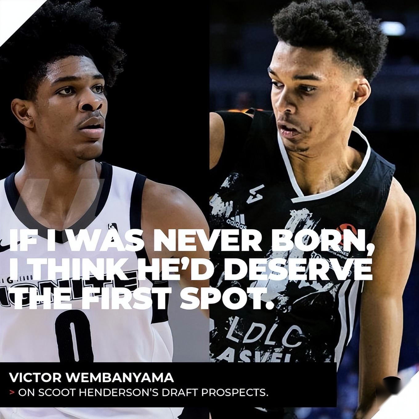 北京时间10月4日,2023年状元热门维克托-文班亚马在训练后接受了采访,他谈到了另一状元热门斯库特-亨德森,他直言:亨德森是一位非常棒的球员,如果我没有出生,那么他应该会是状元秀。