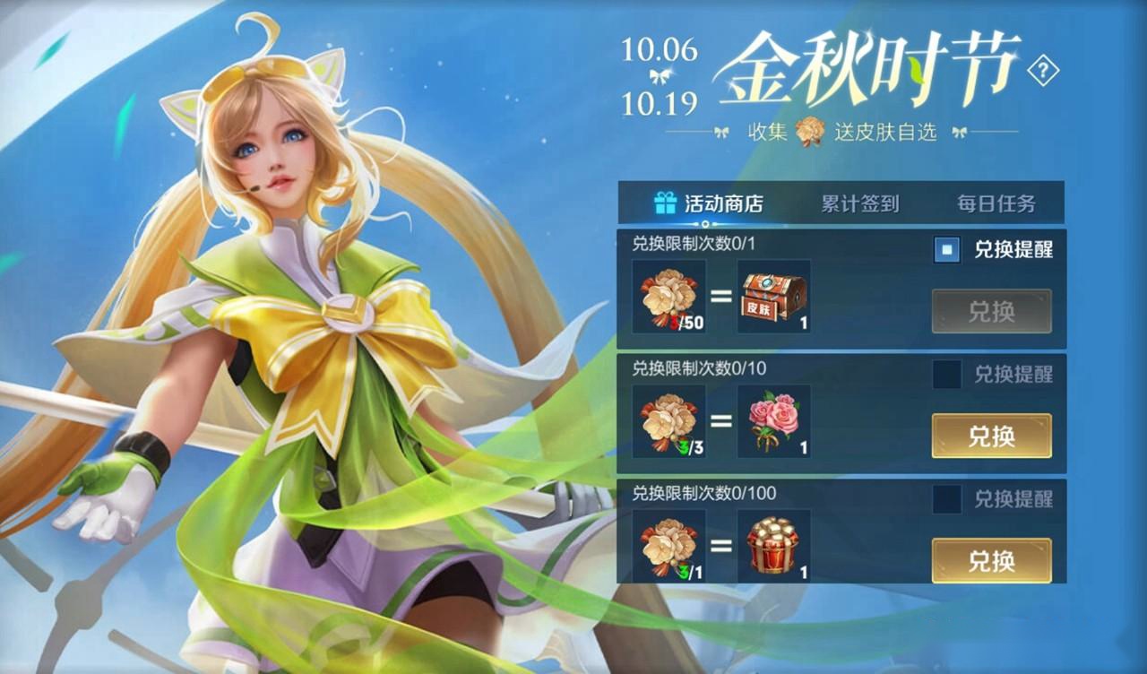 了解完FMVP皮肤,我们再来聊聊版本更新和新福利。为期两周时间的“金秋时节兑换皮肤自选宝箱”的活动正式开启,玩家可通过完成每日参与对局、累计签到和周末挑战任务合计收集78个道具,因为兑换皮肤宝箱需要消耗50个,小编计算后发现最快也要做满七天的任务,也就是12号才能拿到永久皮肤奖励。