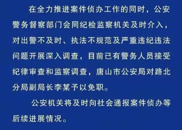 其实在警方6月21日的警情通报中,就已经说明了,当前已经有警务人员在接受相关部门的调查,而唐山市公安局路北分局副局长李某更是被免职。